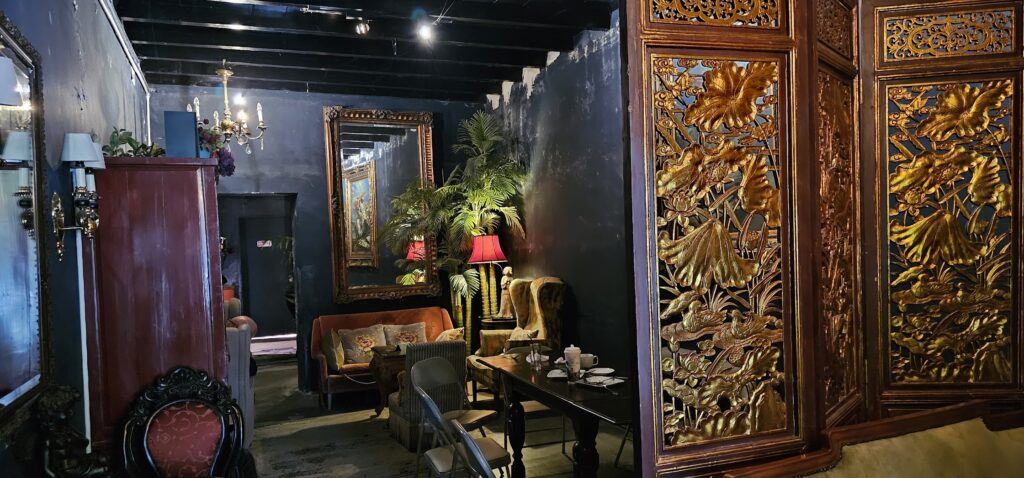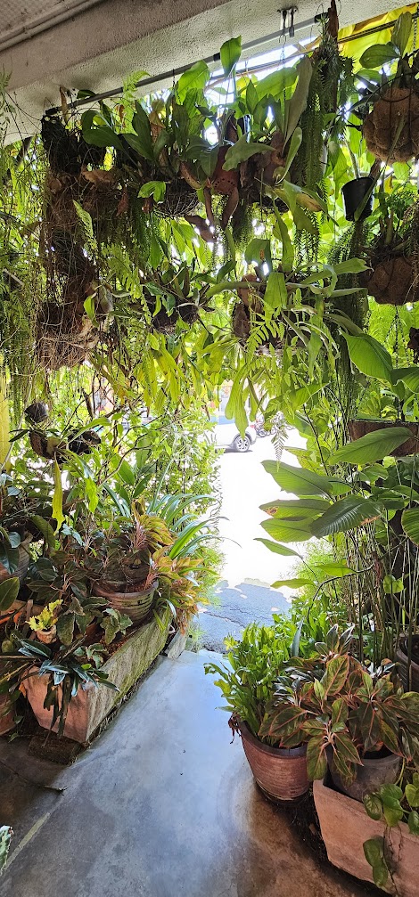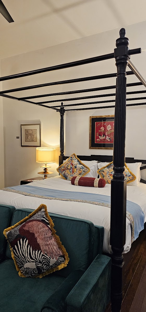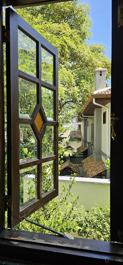 Mutta takaisin Hotel Penagaan. Aivan ihana, historiaa henkivä pikkuhotelli. Katosvuode, puiset käsin käännettävät ikkunasäleiköt ja kaunis sisustus olivat ihana yllätys. Toinen samanlainen ylläri löytyi kulkiessamme kadulla hotellin lähellä. Olimme lähteneet kävelemään ilman päämäärää ja edellämme oli pieni seurue, joka yhtäkkiä katosi ”viherseinän sisälle” kadulta. Seinä oli peittynyt isolta alueelta viherkasveihin eikä siinä ollut mitään kylttiä tmv. Hetken katsoimme silmät pyöreinä ja sitten sukelsimme samojen kasvien sekaan ja päädyimme johonkin eteiseen. Edessä näkyi lisää kasveja ja akvaarioita – hmm, ehkä kukkakauppa? Sitten näkyviin tuli vitriini, jossa oli kakkuja. Kahvila? Kyllä, ja millainen kahvila. Tilasimme kylmiä juomia ja katsoin että juuri ja juuri mahdumme istumaan vähiin pöytiin, mutta tarjoilija ohjasikin meidät pidemmälle. Tilat jatkuivat vielä paljon pidemmälle ja aina kulman takaa tuli uusi tila näkyviin; tummia, hämäriä sohvaryhmiä ja isoja tauluja seinillä. Sekä toki niitä viherkasveja. Tarjoilija tiesi kertoa, että paikassa olisi aiemmin ollut jonkinlainen korjaamo, mutta veikkaan että kiinteistön ikä oli yhtä korkea kuin hotellimme.