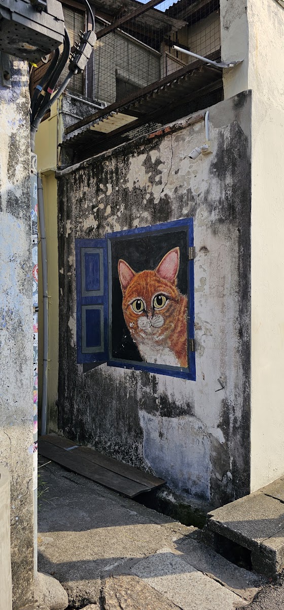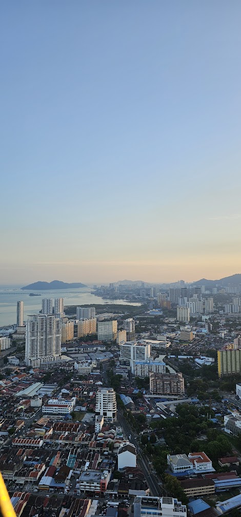 Muuten Penangin päivämme kuluivat mm. käyntiin Penang Hillillä. Köysirata kuljetti molempiin suuntiin. Alaspäin olisi voinut tulla myös kävellen, mutta kuumuus iltapäivällä oli jo aika kova. Lisäksi olimme vielä suuntaamassa George Towniin samana päivänä. Jos Penang Hillillä oli hienot näköalat, niin sitä ne olivat myös Penangin korkeimmassa rakennuksessa, Komtar-tornissa. Komtarin näköalaterassilla kävimme auringonlaskun aikaan ja astelimme ensimmäistä kertaa lasilattialla. George Townissa kävelimme ihan turisteina paperikartta kourassa. Siitä oli helppo jäljittää katutaidekohteita ja samalla kiertää katuja hiki otsalla. Reppumies hieman hyytyi elektrolyyttijuomista huolimatta ja etsiytyi johonkin ilmastoituun baariin. Itsehän jaksoin vielä kävellä reilun kilometrin matkan takaisin hotellille.