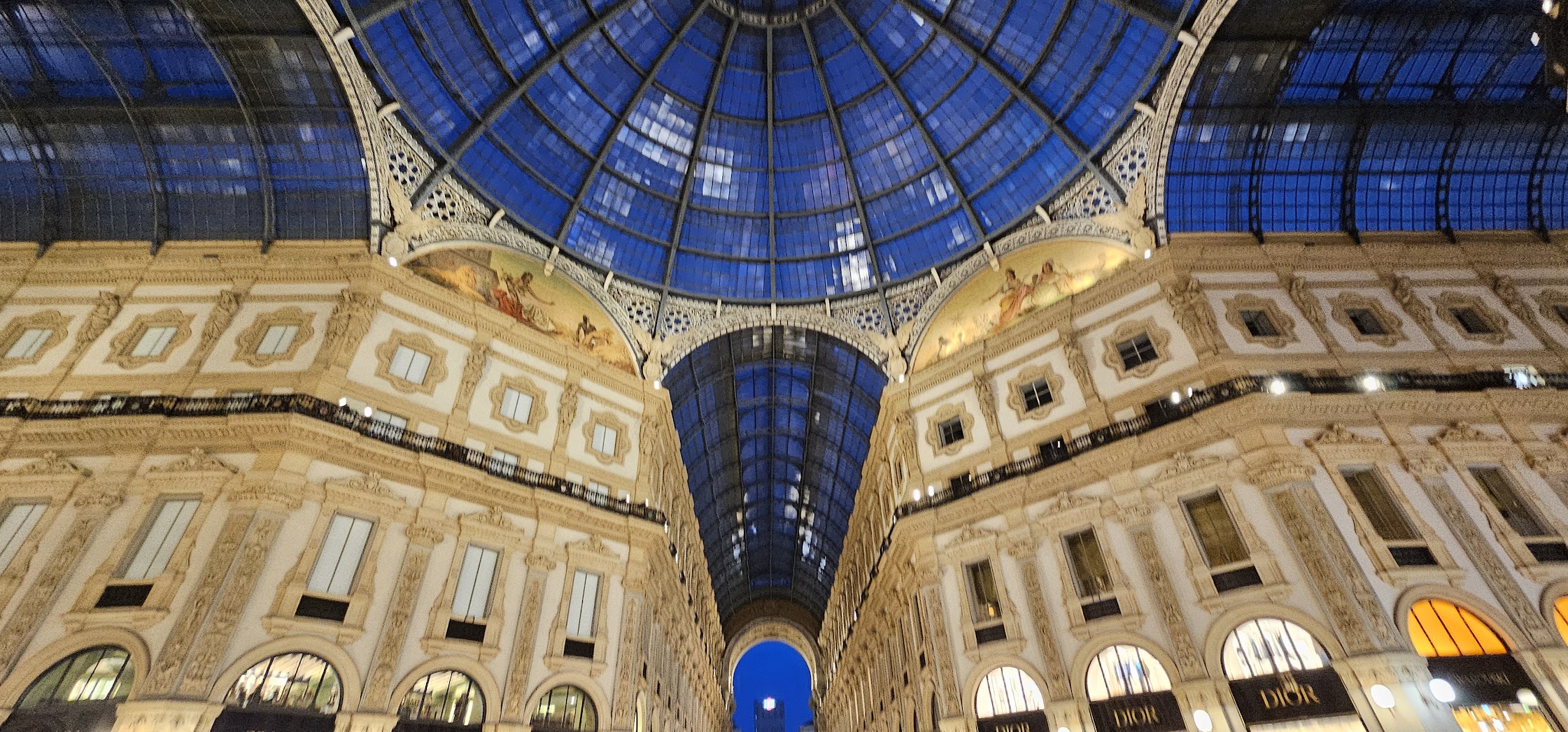 Ostoskeskus Galleria Vittorio Emanuele II sijaitsee aivan Duomon vieressä. Rakennus on yhtä mahtipontinen kuin nimensä ja Italian vanhin ostoskeskus, josta löytyvät kaikki luksusmerkkiliikkeet, kahviloita ja ravintoloita. Keväinen sää oli saanut väen liikkeelle ja terassipaikat olivat lähes täynnä, joten suunnistimme ostoskeskuksen sisätiloihin ruokailemaan. Ruutuliinaisen pöydän ääressä oli hauska pohtia minkä näköinen tämä kimalteleva, lasikattoinen ostosparatiisi on alun perin ollutkaan 1800-luvulla.