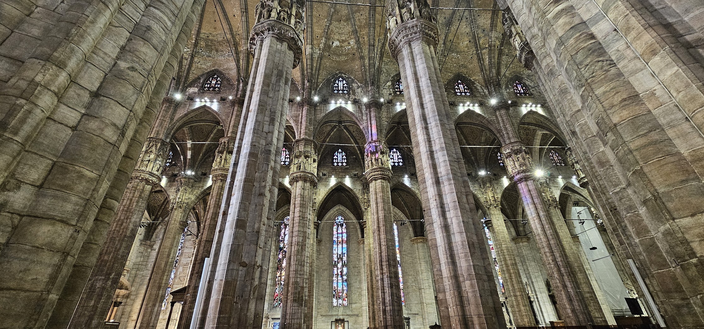 Duomo di Milano eli tuomiokirkko on tietysti vaikuttavuudessaan ehdoton nähtävyys. Ikää ja kokoa on tällä 40 000 ihmistä sisäänsä mahduttavalla Euroopan toiseksi suurimmalla katedraalilla enemmän kuin ensi silmäyksellä voi ymmärtää. Olimme paikalla myöhään iltapäivällä ja jonot olivat melkoisia. Emme edes lähteneet jonottamaan näköalatasanteelle, vaan otimme liput kirkon sisätiloihin. Kyllä tunsi itsensä todella pieneksi sisätiloja kiertäessä.