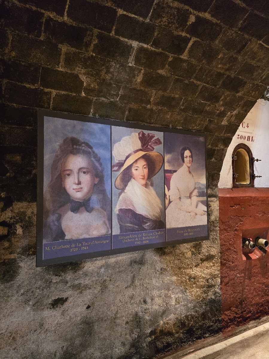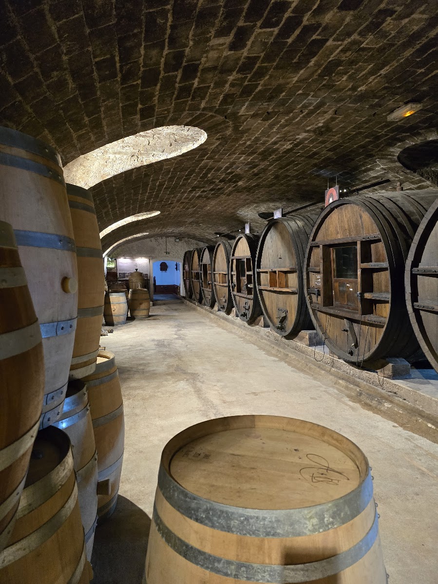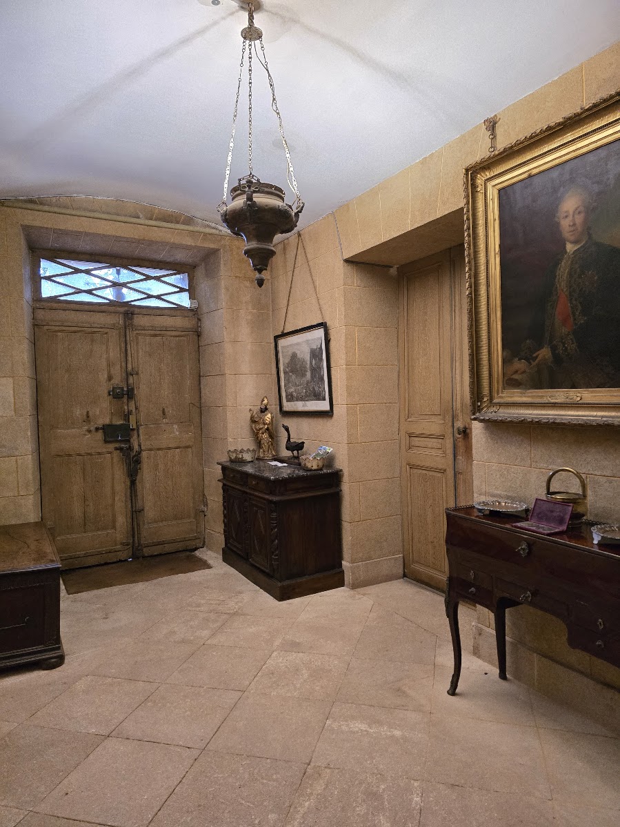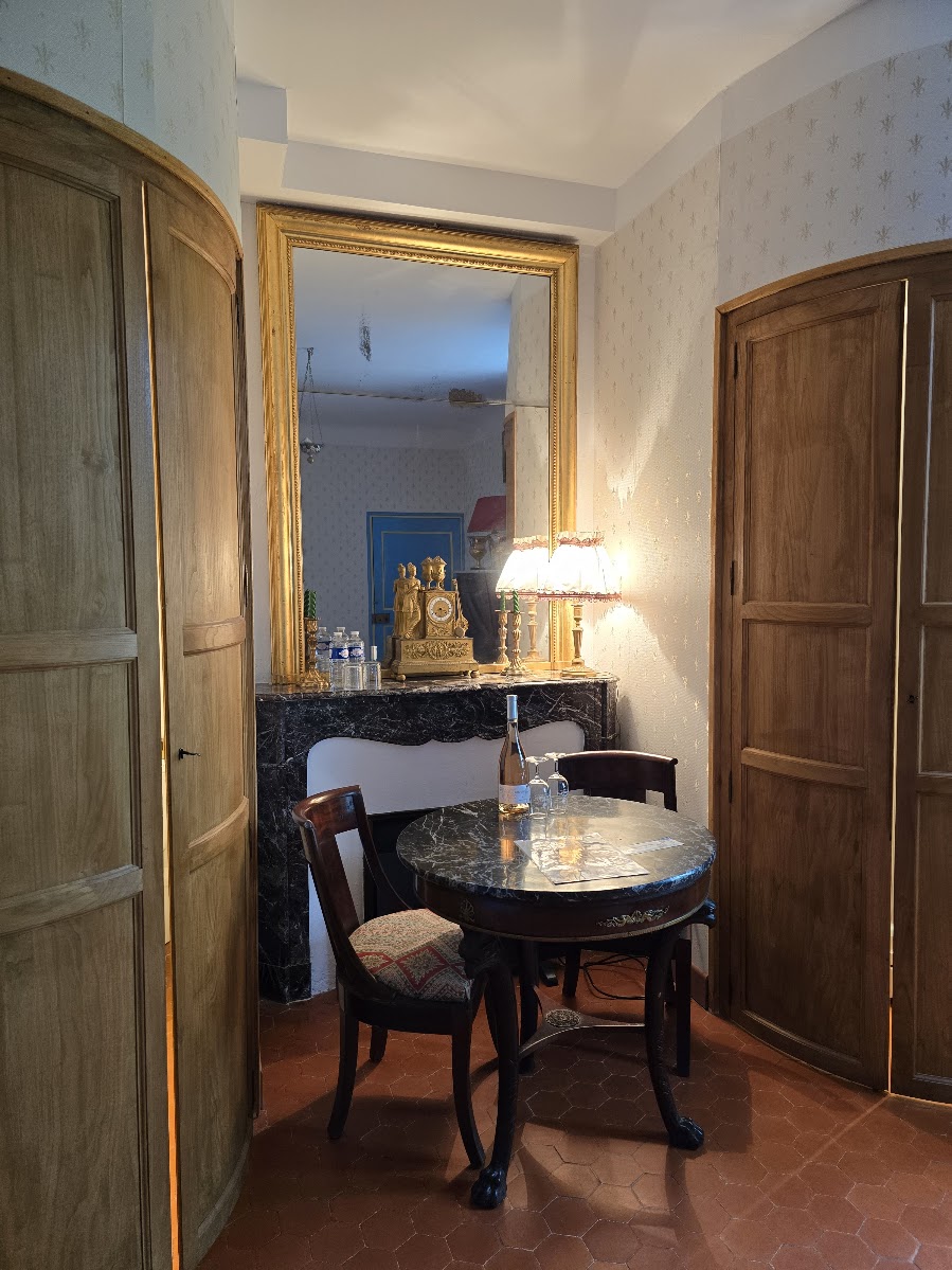 Sukuhistoria ja samalla viininviljelyn ja Ranskan historia on hienosti esillä tilan yllättävän modernissa museossa. Meidän huoneemme oli 1740 rakennetussa isossa rakennuksessa, toisen kerroksen Empire-huoneessa. Jos täällä ei tuntenut itseään linnanneidoksi, niin sitten ei missään. Reppumiestä ehkä vähän jännitti illan tullen melko autiossa rakennuksessa, jossa taisimme olla ainoat vieraat. Meidän kerroksessamme oli kirjastohuone takkoineen ja upottavine nojatuoleineen. Sinne suuntasimme huoneessa olleen tervetuliaisroseviinin kera istuskelemaan iltaa. Empire-huoneestamme löytyivät kaikki mukavuudet, vaikka yleisilme olikin menneen maailman tunnelmaa. Pimeys oli totaalinen, kun valot sammuivat ja samettiverhot oli vedetty ikkunoiden eteen (vanhojen ikkunoiden avausmekanismi voi olla todella monimutkainen). Saatoin kuulla helmojen kahinaa käytävästä tässä kohtaa. Talon päädyssä asusteli perheen isoäiti koiriensa kanssa ja olettaisin hänen myös hoitaneen aamiaisen saliin. Rakennukset olivat juuri sopivan rustiikkisia, että pienellä mielikuvituksella pystyi kuvittelemaan millaista elämä viinitarhojen äärellä, on vuosisatojen aikana ollut ja mitä kaikkea koettu. Välillä on lähdetty sotimaan, säät ovat tuhonneet viljelykset olemattomiin ja ovatpa viinitoimitukset olleet osana poliittista historiaakin.