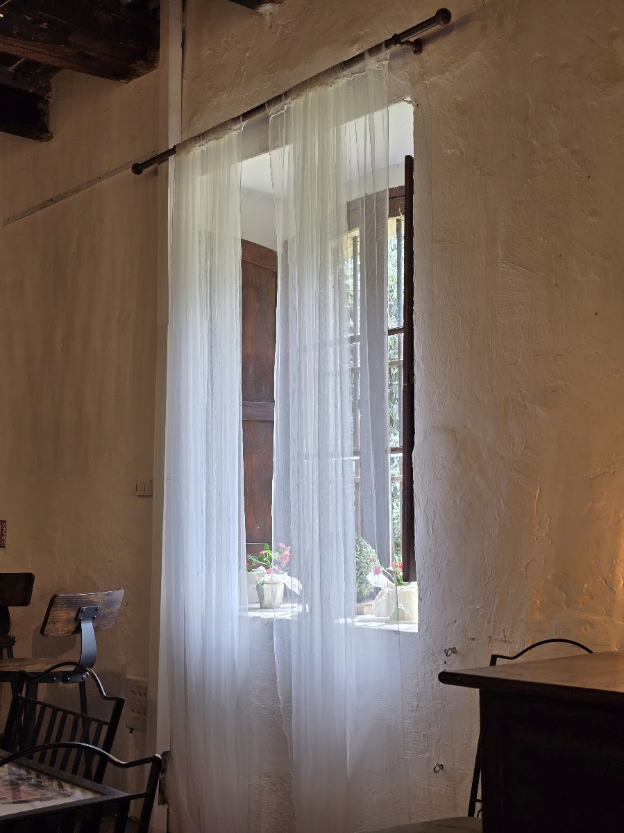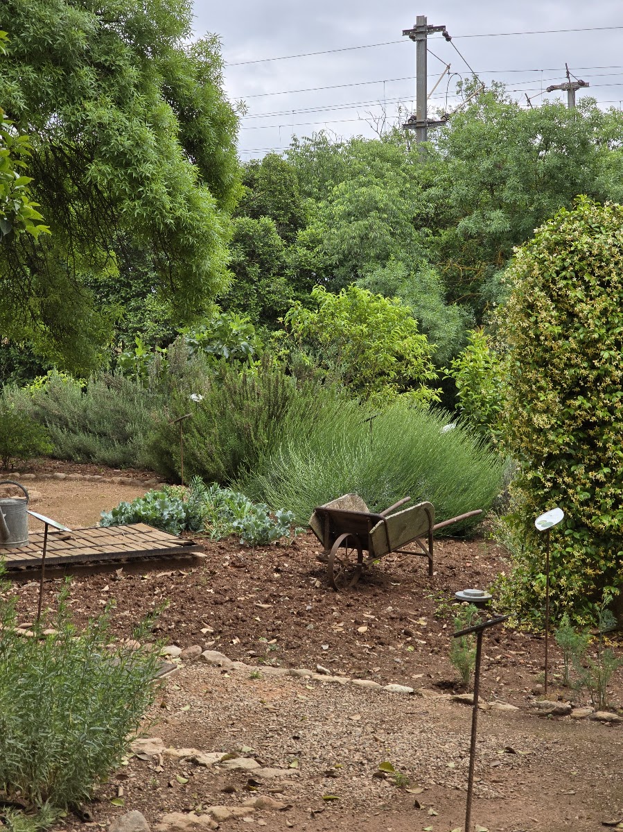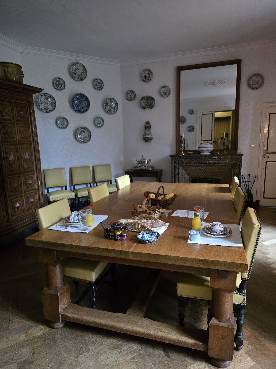Seuraavana aamuna aamiaissalissa oli muitakin. Edellisenä iltana näimmekin jo saksalaispariskunnan tulevan koiransa kanssa ja nyt he olivat aamiaisella. Koiran nimi oli Lucy ja hän oli itse rauhallisuus. Seinän takana olivat myös isoäidin pienemmät ja ei niin rauhalliset koirat, jotka kyllä huomioivat vieraat äänekkäästi. Aamiainen oli ranskalaiseen tapaan kevyt; kahvia, teetä, mehua, patonkia, levitteitä, kananmunia, jugurtteja. Tutustuin tällä autoreissulla ranskalaisiin, pienissä lasipurkeissa oleviin, jugurtteihin ja ne veivät kielen mennessään. Aikaisin aamulla oli satanut ja ukkostanut melko rajusti, mutta nyt ukkonen ainakin näytti väistyneen. Autoa pakatessa talon grand old lady tuli päivittelemään säätä ja kertoi naapurikylässä sataneen myös rakeita ja sikäläisen viinisadon menneen sen myötä. Ehdottomasti yksi mieleenpainuvimmista kohteista tämän reissun aikana.