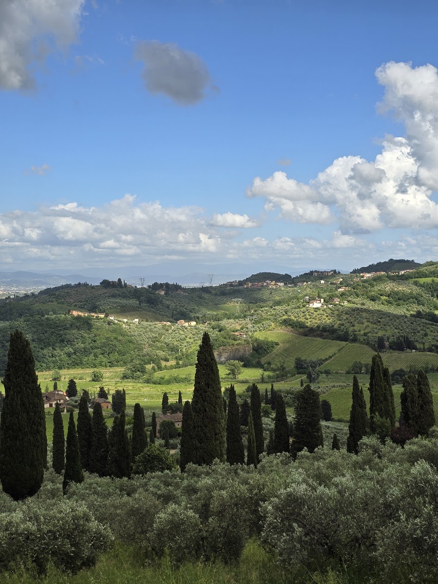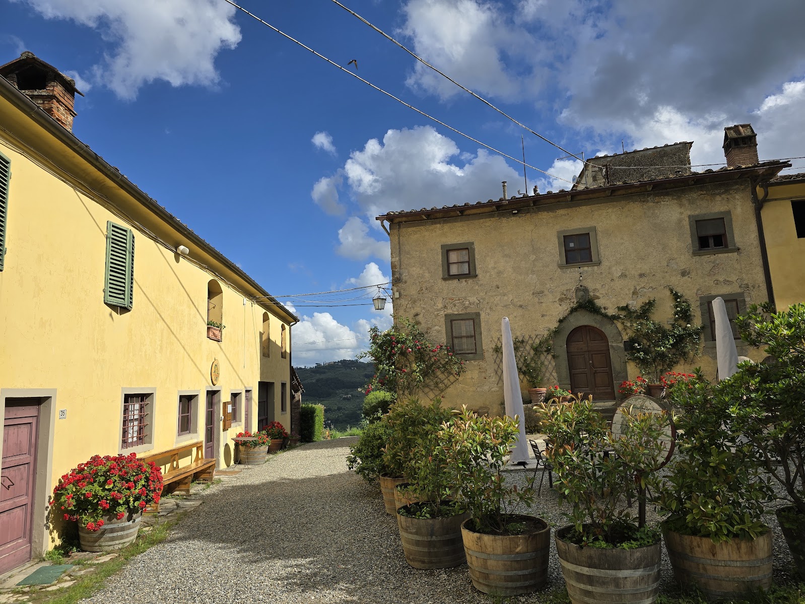 Ruokapaikaksi valikoitui matkan varrella oleva pieni Vincin kylä ja sen pizzeria. Majoituksemme oli samaisessa kylässä oleva Cantagrillo Resort, jonne oli ainakin kolme eri reittiohjetta ja toki kokeilimme ensin ne kaikki väärät ”lehmipolut”. Tämä idyllinen pieni paikka oli keskellä Toscanan maaseutua ja oikein viihtyisäksi sisustettu. Todellista Toscanan idylliä oli luvassa seuraavana aamuna sään, maisemien ja aamupalan muodossa. Pellot ympärillä levittäytyivät auringonpaisteessa ja aamiaisen sai nauttia terassipöydässä. Pieni, mutta kauniiksi laitettu paikka, josta jatkoimme matkaa Firenzeen.